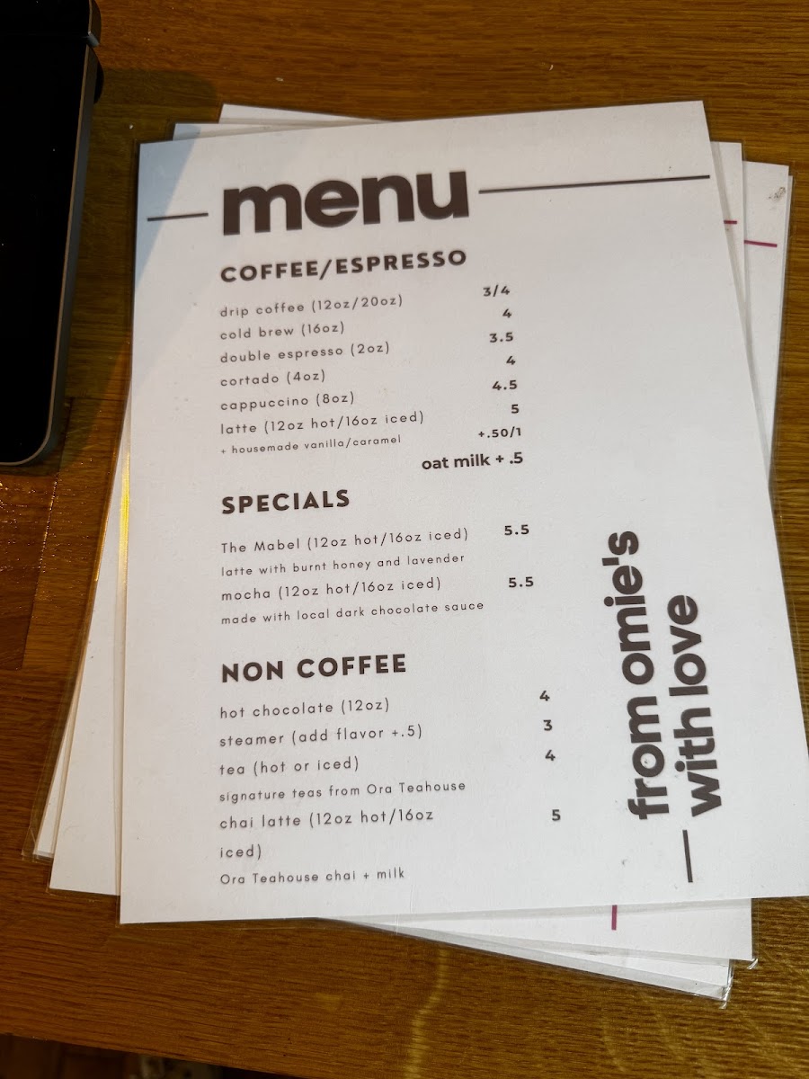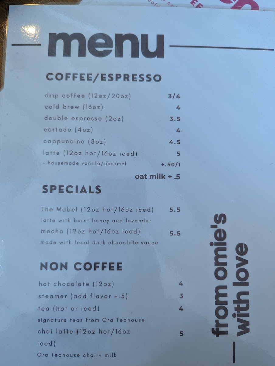 “ Omie's is a neighborhood gem that I am so grateful we have! The lattes are out of this world- espresso forward, but with great and creative flavors. The PB&J latte is my current favorite and I keep going back for more. Parking can be a bit difficult in their lot, but keep in mind that you can park at King's which makes it much easier. I also bought one of their bags of coffee and they will grind it to your specified size in house which was a wonderful perk. I will continue to go back regularly! Thank you for always making my day with the best lattes, Omie's! ”